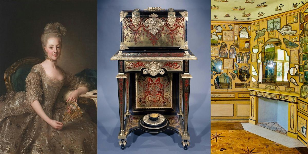 IMAGES ON BANNER ABOVE: Detail, Portrait of Hedvig Elisabet Charlotta, Princess of Sweden, by Alexander Roslin (1775) Nationalmuseum, Sweden. Public domain. André-Charles Boulle, coffer-on-stand ã Chatsworth House Trust; detail mirror shard cabinet, apartment of Margravine Wilhelmine of Bayreuth (1709–1758), Old Palace of the Hermitage in Bayreuth, c. 1750, © Bavarian Administration of Palaces, Gardens and Lakes, Photo: Achim Bunz.
