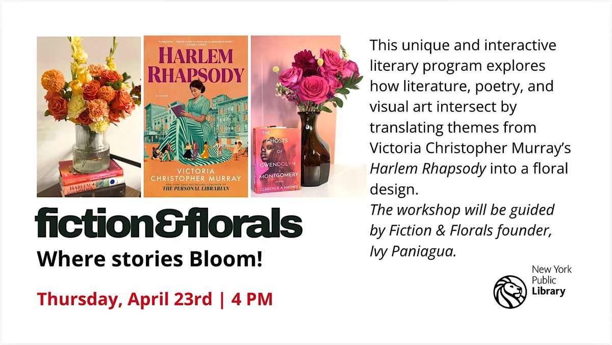 This National Poetry Month, join us for Fiction & Florals, a floral design workshop inspired by literature. This unique and interactive literary program explores how literature, poetry, and visual art intersect by translating themes from Harlem Rhapsody into floral design. For this edition of Fiction & Florals, guided by Ivy Paniagua, we’ll learn how to make a floral arrangement inspired by by Victoria Christopher Murray.