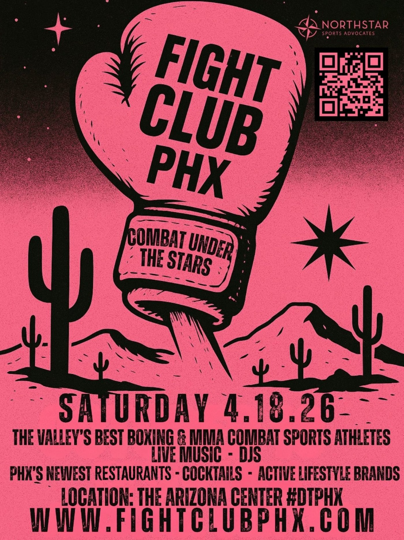 Fight Club PHX debuts April 18 at Arizona Center, the first-ever Fight Club event, promoted by Northstar Sports Advocates. Doors open at 3 p.m. with an MMA pro-am card featuring top local talent, followed by a professional boxing event with eight fights. The main event starts at 10:10 p.m., followed by a VIP after-party. Event ambassadors “Showtime” Shawn Porter and Stipe Miocic will be on-site, and attendees can enjoy live music, vendor booths, fan experiences, and a variety of food and cocktails.