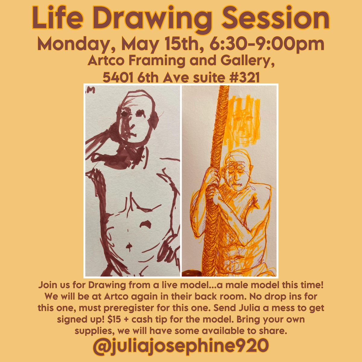 Drawing from a live model is always a challenge, but a fun challenge! This month we are at Artco framing and gallery, 5401 6th Ave suite #321. We will have some supplies, but bring your own amd what you are comfortable with. Please arrive between 6:30-6:45 to find a spot and for introductions. We will begin drawing at 7:00 and do timed poses starting with 1-5min poses and then getting longer to 15-20min poses. We will have breaks in between. It’s going to be a fun night! It is always a fun range of skill levels who attend. Some folks are very new to drawing, some haven’t done it since college, and others have been doing it for 20years! All are welcome to come and draw :) It is a welcoming environment for all