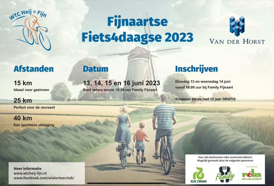 WielerToerClub Heij=Fijn viert dit jaar zijn vijf-jarig jubileum. Tijdens dit jubileumjaar mag de Fijnaartse Fiets4daagse natuurlijk niet ontbreken. Dit inmiddels succesvolle evenement zal voor de vijfde keer worden georganiseerd.