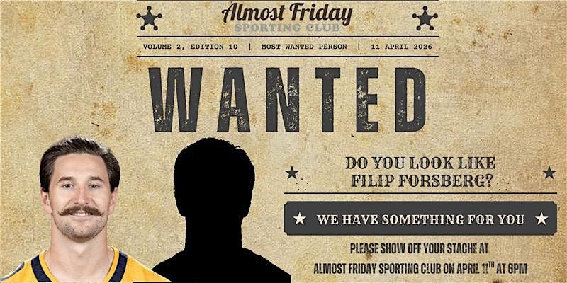 Join us at Almost Friday Sporting Club in Nashville at 6 PM on April 11th for a Filip Forsberg Lookalike Contest celebrating one of the sharpest mustaches in hockey. Whether you’ve got the perfectly curled lip sweater, the Swedish flow, or just the confidence of a top-line winger, we want to see your best Forsberg impression.