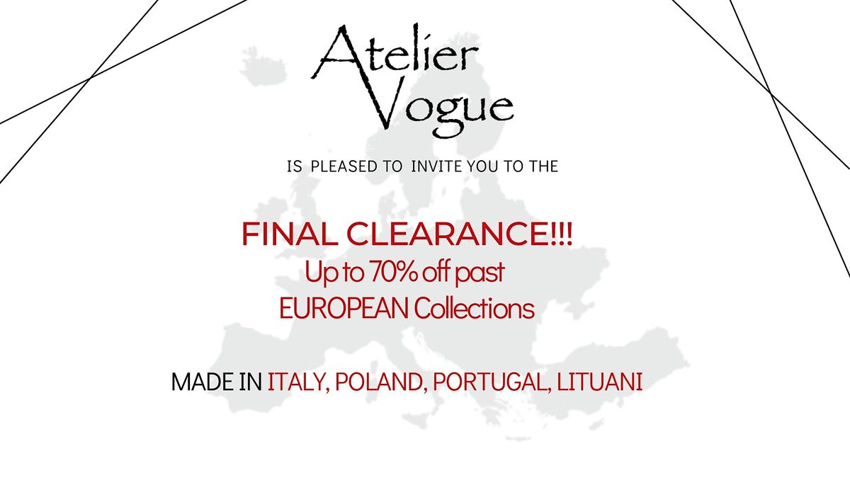 We are pleased to invite you to an exclusive Final Clearance Event featuring a curated selection of past European collections, offered at up to 70% off.