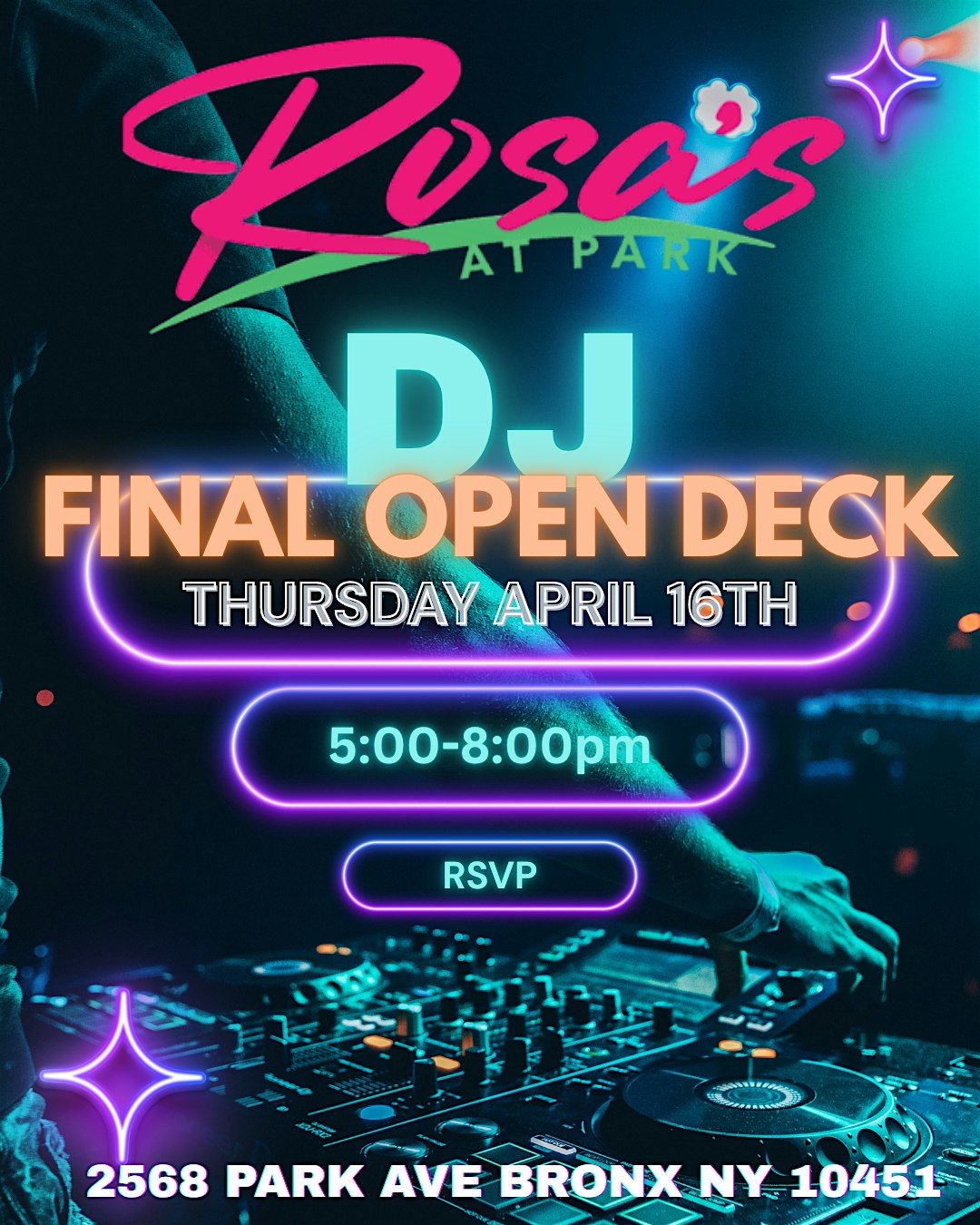 Join us for our final DJ Open Deck on Thursday, April 16th from 5–8PM. DJs with experience are encouraged to apply for a chance to showcase their sound and be considered for our upcoming rooftop season starting May 5th.