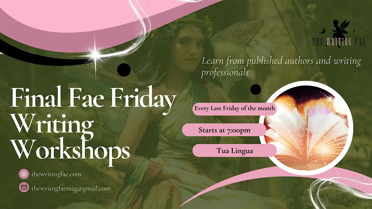 Welcome to Final Fae Friday Writing Workshops at Tua Lingua! Join us on on the last friday of the month at 7:00 PM for a magical evening of creativity and inspiration. π§β¨ Dive into the world of fantasy writing with fellow enthusiasts and sharpen your storytelling skills. Whether you're a seasoned writer or just starting out, this workshop is perfect for all levels. Let your imagination run wild and bring your stories to life! Don't miss out on this enchanting opportunity to connect with other writers and explore the realm of fae together. See you there! (Eastern Time)