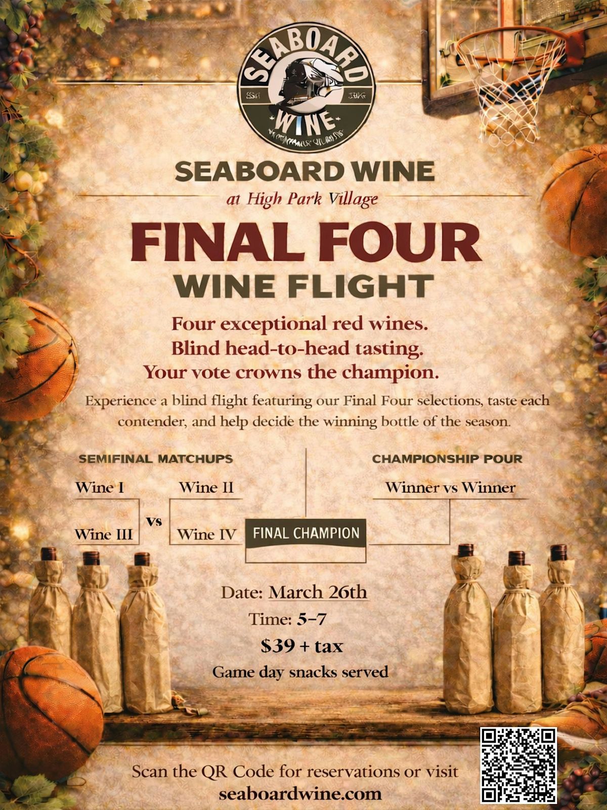 Experience blind flights featuring our Final Four selections. Taste each contender, fill in the brackets, and help decide the winning bottle of the season. This is a casual, self directed tasting featuring four exceptional red wines. Stop by any time between 5-7pm for your flight. Game day snacks included. $39 plus tax.