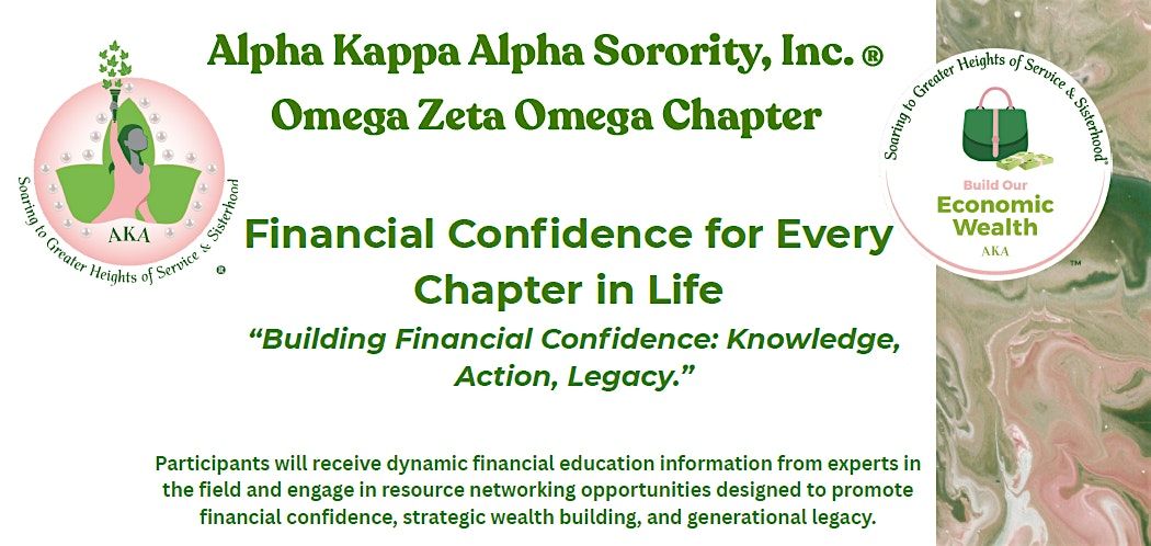 Omega Zeta Omega Chapter, Alpha Kappa Alpha Sorority, Incorporatedยฎ, this event empowers our community to take charge of their financial futures. Participants will receive dynamic financial education information from experts in the field and engage in resource netoworking opportunities designed to promote financial confidence, strategic wealth building, and generational legacy.