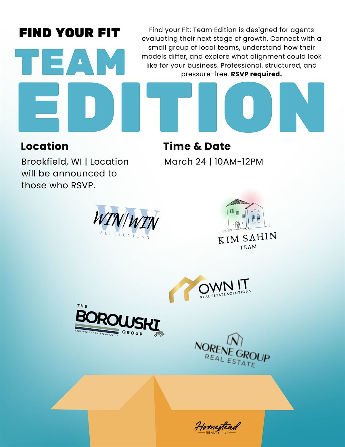 Find Your Fit: Real Estate Team Edition is a structured event designed for real estate agents exploring whether joining a team could elevate their business. Through a guided, speed-rotation format, attendees will meet several local team models, learn who they are best suited for, and gain clarity around structure, support, and expectations. This is not a recruiting rally or pitch competition — it is a professional, pressure-free environment focused on alignment and thoughtful evaluation. Attendance is curated to ensure meaningful conversations. Exact location details will be shared with confirmed registrants.