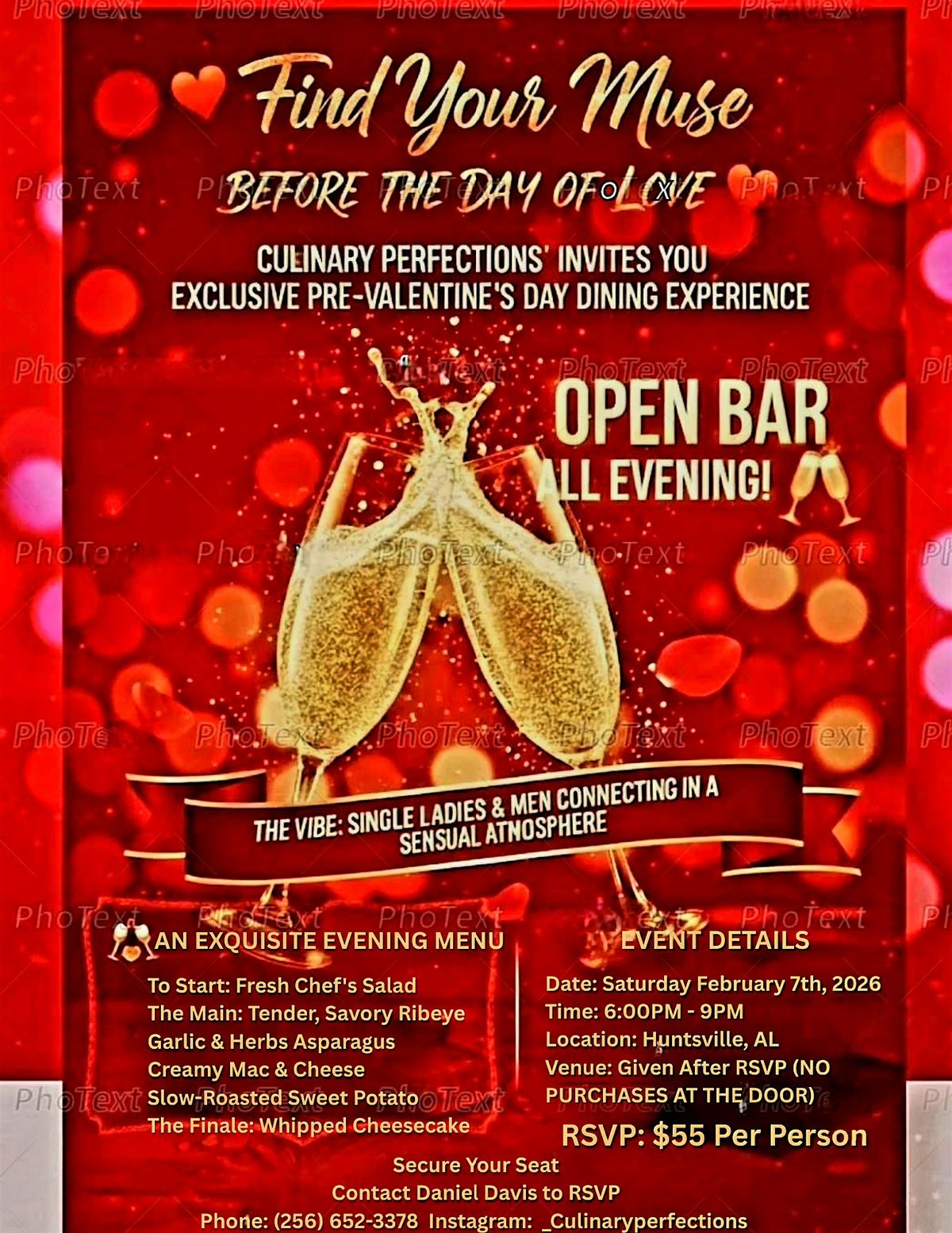 Culinary Perfections' invites you to an exclusive Pre-Valentine’s Day Event! OPEN BAR!