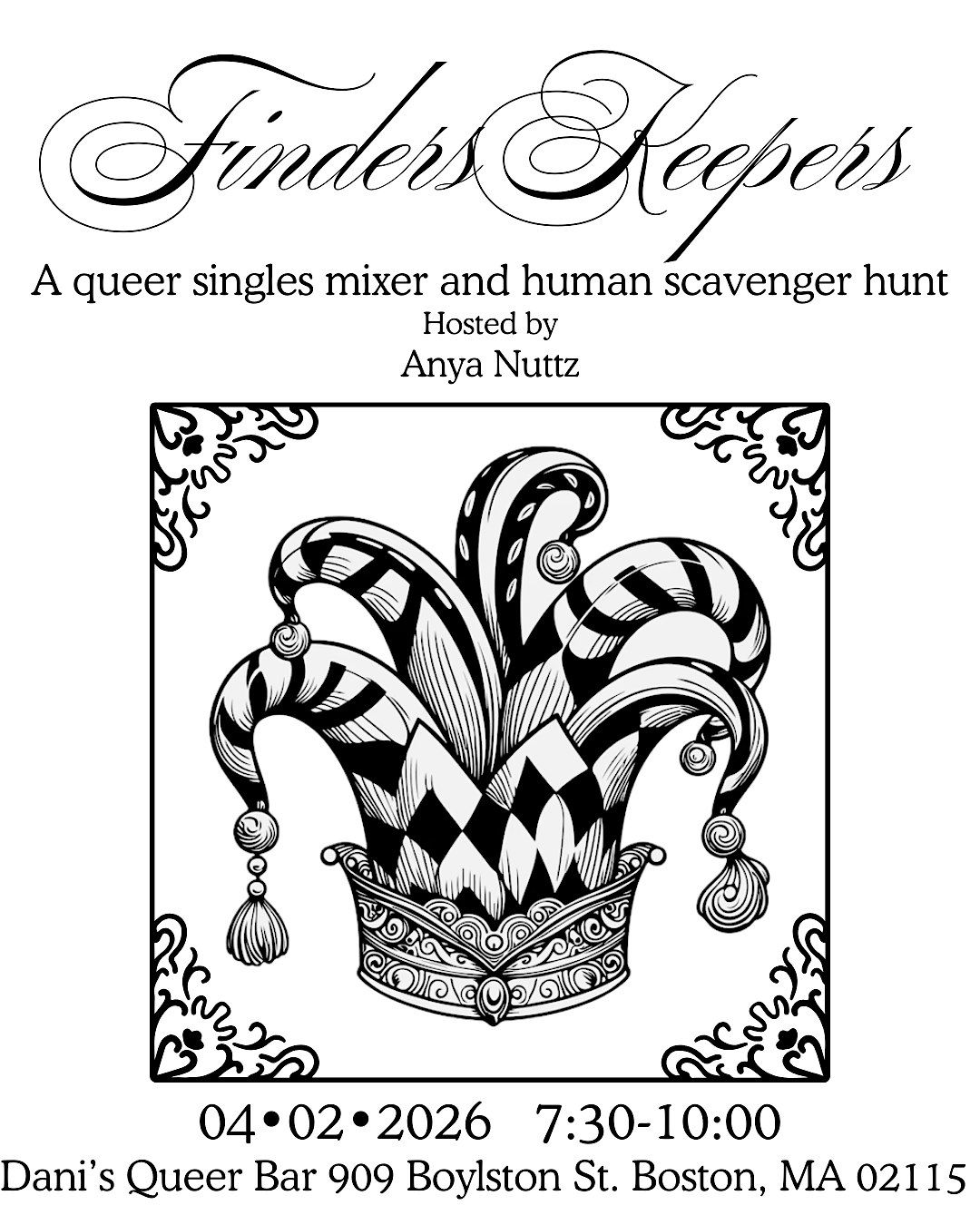 Come to the basement of Dani’s and find the love of your life… or someone you just want to kiss. Wear a white tshirt with a white lie written on it. Once you check in you will get a checklist of scavenger hunt prompts to complete or to ignore while you flirt your way around the room. If you don’t check in by 9 entry is subject to capacity of the space. Happy flirting and happy hunting.