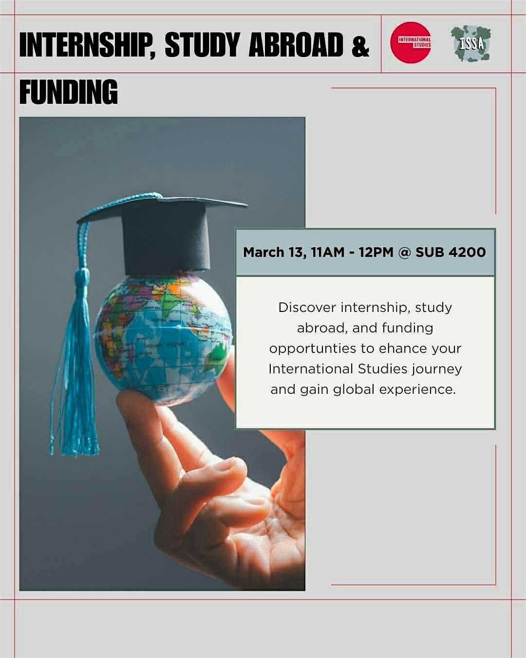 Designed for International Studies majors, this session highlights study abroad programs, volunteering, and internship opportunities, along with practical guidance on how to find and apply for them. We will also cover funding options available within International Studies to help students navigate financial support for their academic and professional goals.
