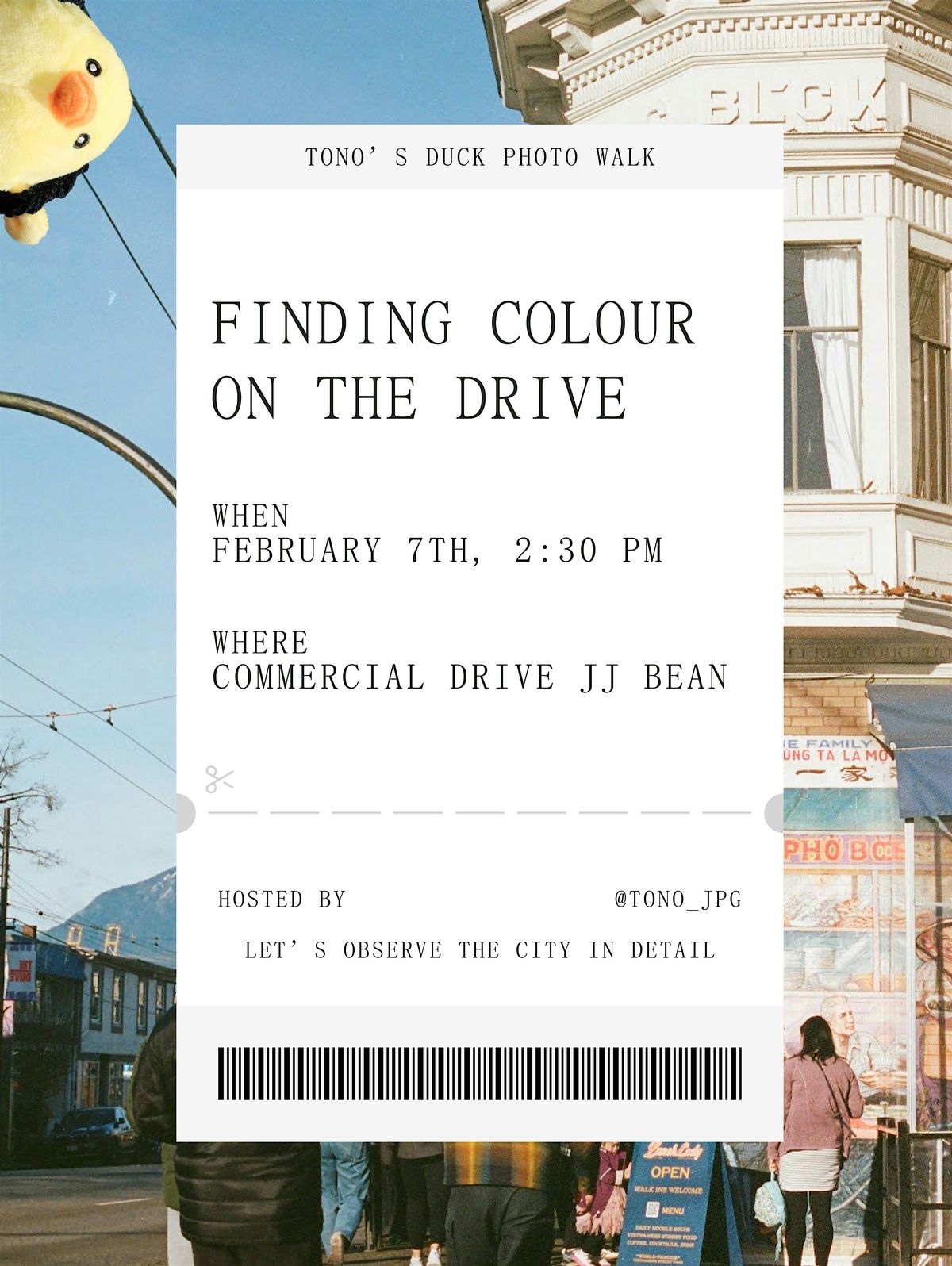 A colour hunt photo walk on Commercial drive!All skill levels and friends welcome.