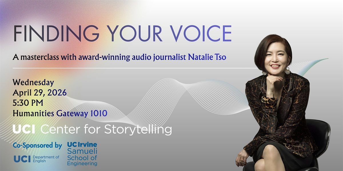 Join the UC Irvine Center for Storytelling, the Department of English, the Literary Journalism Program, and the Samueli School of Engineering for a masterclass with award-winning audio journalist Natalie Tso. In this hands-on and engaging workshop, participants will explore three facets of voice in audio storytelling: How to find your voice as a storyteller; How to craft compelling audio stories using other people's voices; and How to best use your own voice for audio. This event is free and open to the public; all are welcome!