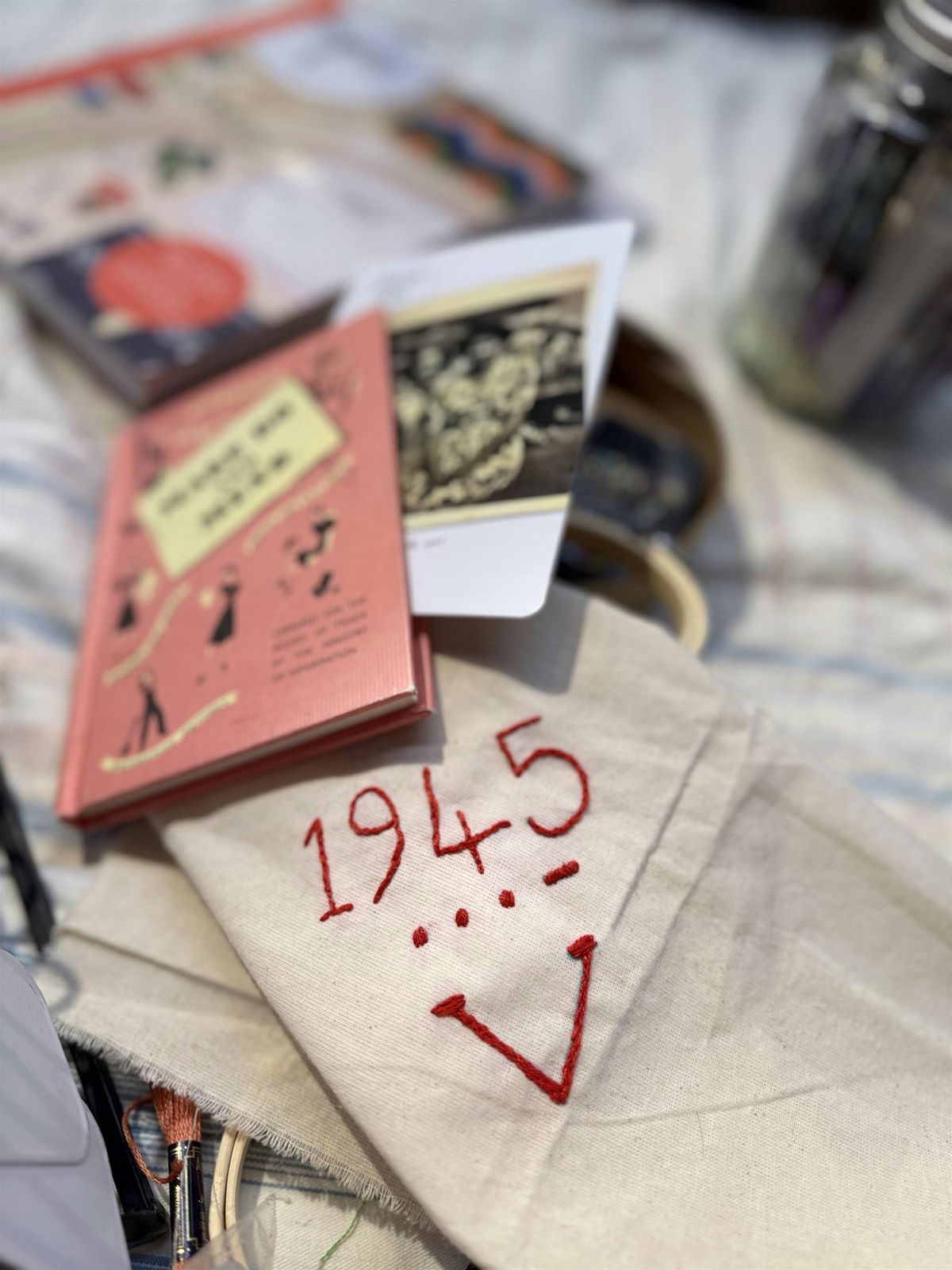 Almost year ago a collaborative sewing activity toook place at PRONI to remember, through stitch and conversation , the 80th Anniversary of VE Day , 8 May 2025.Since then ,with over 200 participants, and using pre loved fabricsand gifted linens , regular sewing sessions and contact a unique piece of work has emerged . We celebrated VE Day , and remembered those liberated some time later in the Far East for VJDay ,You Are Not Forgotten and for Rememberance Day we acknowledged not only those lost through conflict but also those who have passed away who were born during WW2, at that session estimated that 29,500 Stitches was a stitch a day for 80 years . The piece has grown and shares some amazing stories of both love , hardship , separation and loss .For Internatiinal Women’s Day 2026 with a theme of Give to Gain , we stitched in shades of purple to remember women who we cherished admired and respected . Around the edge of the textile is a deep red edge embroidered in white, a consistent reminder of the famous Morse Code symbol for V, for Victory ( dot dot dot dash) that was broadcast to announce the ceasing of hostility in Europe . One participant has painstakingly undertaken this task and now the embroidery and stitching down of the edge is complete .