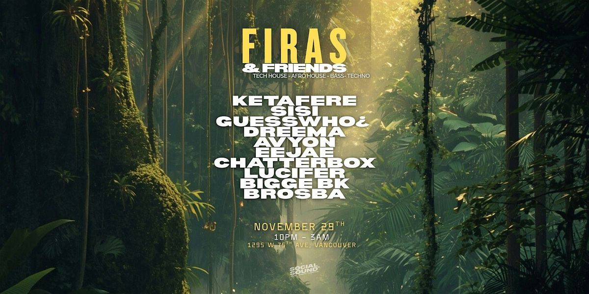 Join FIRAS & FRIENDS for a night where Tech House, Afro House, and Bass-Techno come together. On November 29th, from 10 PM to 3 AM at 1295 W 75th Ave in Vancouver, enjoy an immersive event with a strong lineup of underground DJs.Ketafere, Sisi, GuessWho, Dreema, Avyon, Eejae, Chatterbox, Lucifer, Biggie BK, Brosba, Firas.