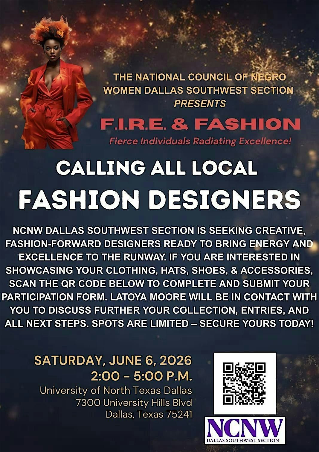 FASHION DESIGNERS register to showcase your original designs on the runway! Get ready for an awesome afternoon at University of North Texas at Dallas! Join us on June 6, 2026 at 2:00 PM (Central Time) for F.I.R.E. & FASHION, where style meets passion in a fun, laid-back setting. Introduce your creativity in fashionable clothing, hats, shoes and accessories while enjoying the vibes and cool people at this exciting event – see you there!