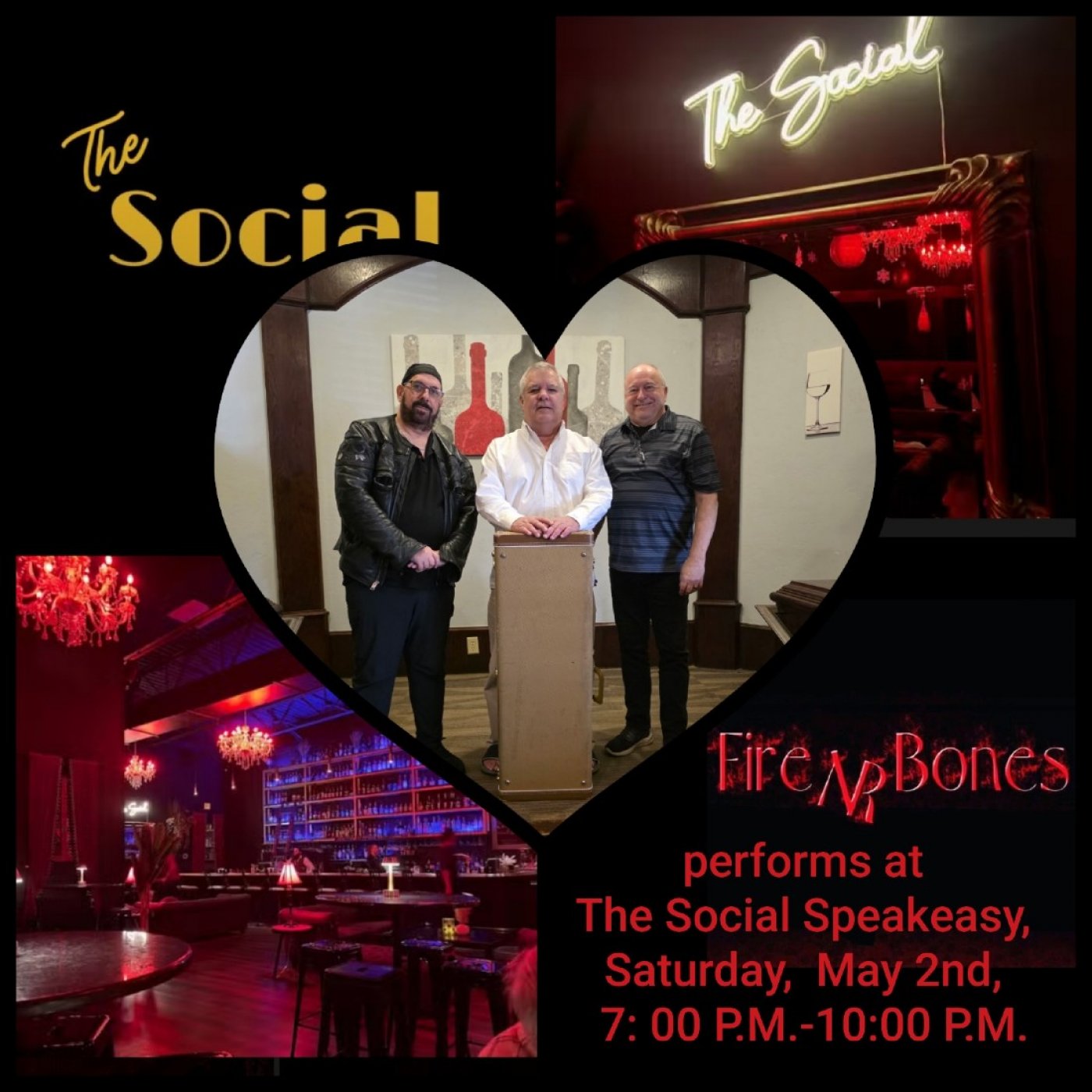 Fire NR Bones, an instrumental jazz and blues trio, performs at The Social Speakeasy on May 2nd from 7:00 P.M. to 10:00 P.M.