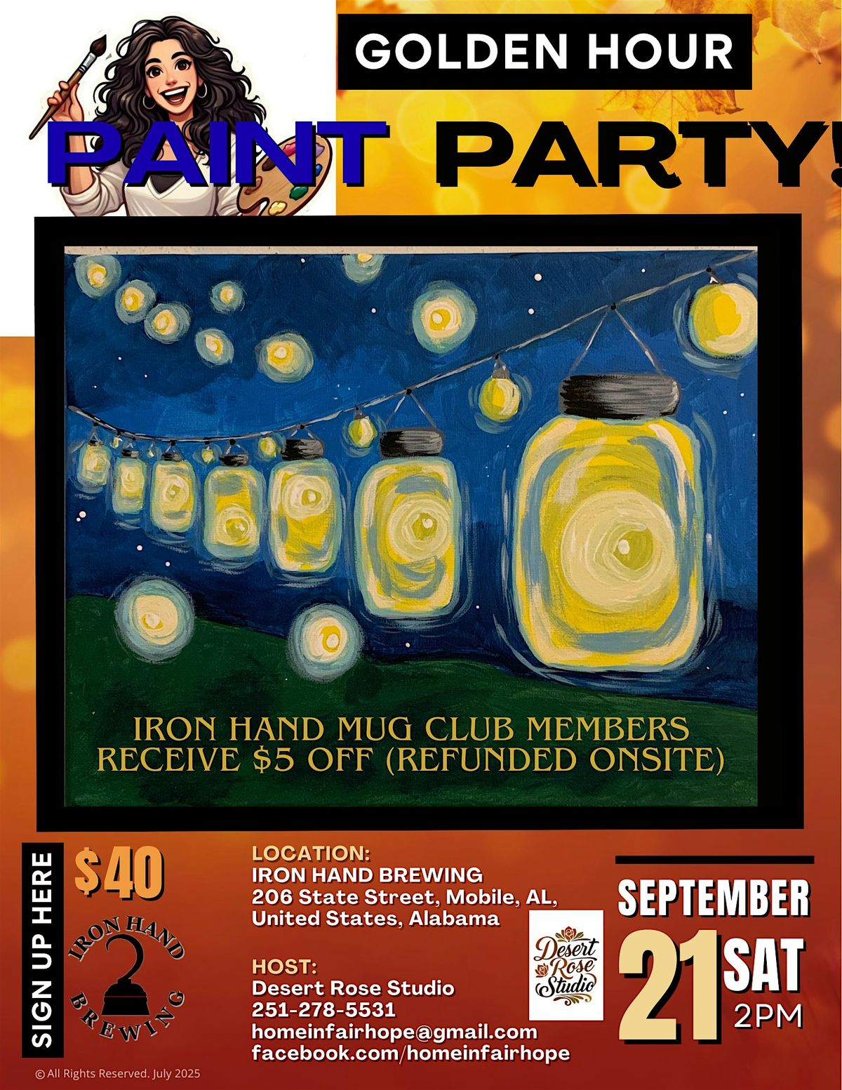 Get ready for a fun-filled afternoon of creativity and good vibes! Join us in person at Iron Hand Brewing for the Firefly Golden Hour Paint and Sip Party. Whether you're a painting pro or just looking to try something new, this is the perfect chance to relax, sip on your favorite brew, and create a masterpiece. Bring your friends, unleash your inner artist, and enjoy the golden hour glow with us!
