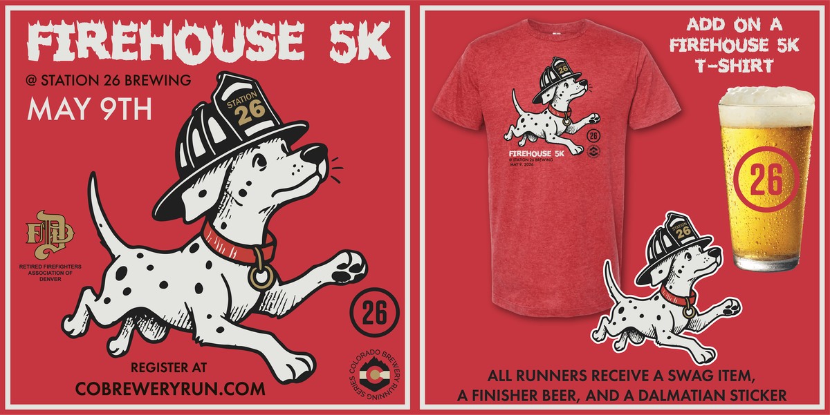 Join us for The Firehouse 5k @ Station 26 Brewing on May 9, 2026, for a 5k-ish, fun run event that starts and ends at this awesome taproom in Denver. Run, walk, jog - whatever goes! Complete the course and celebrate with us and a FREE, local craft brew at the finish line. A portion of proceeds benefits the Retired Firefighters Association of Denver.