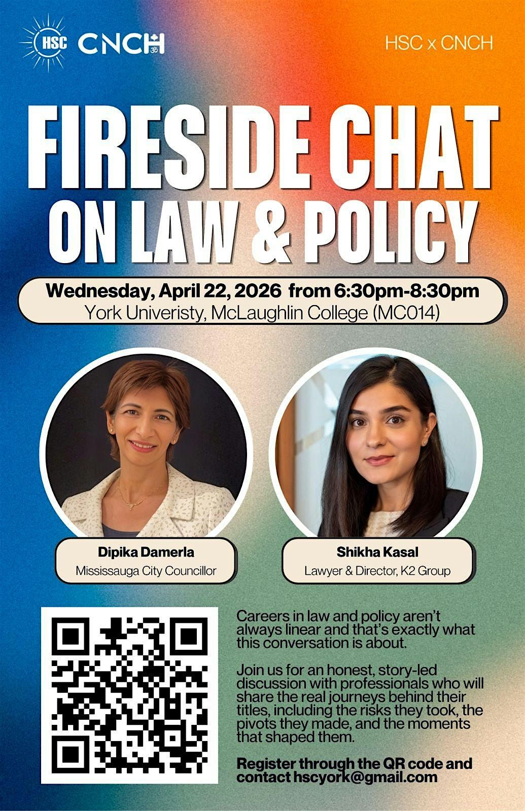 You are invited to attend Fireside Chats: Law & Politics hosted by Hindu Students Council and CNCH, an intimate, story-led conversation designed for students, young professionals (ages 18–35), and early-career individuals interested in law, public policy, governance, and civic leadership.