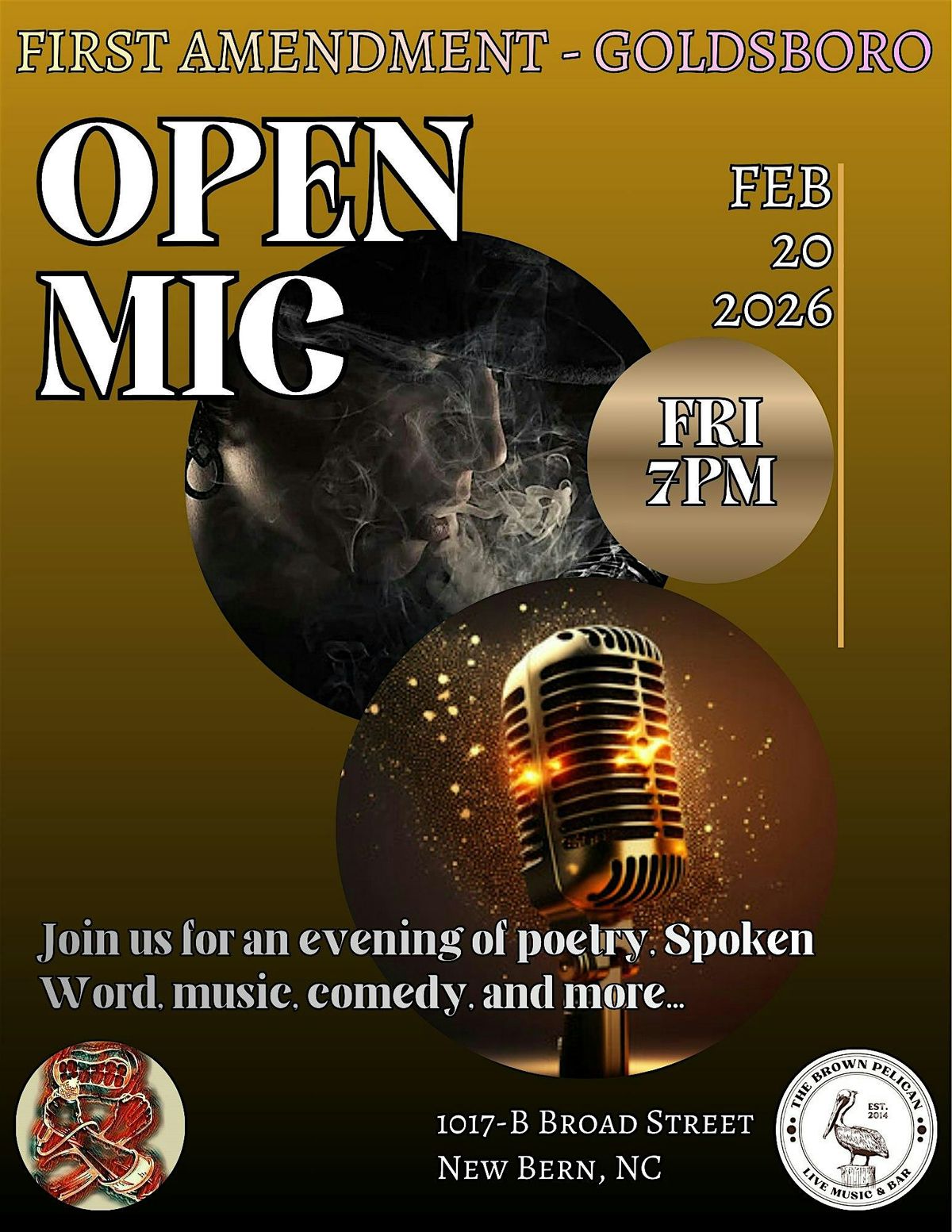 Welcome to the **First Amendment - Goldsboro Open Mic** event! Join us at **The Brown Pelican** for a night of creativity and expression on **February 20, 2026 at 7:00 PM** (Eastern Time).
