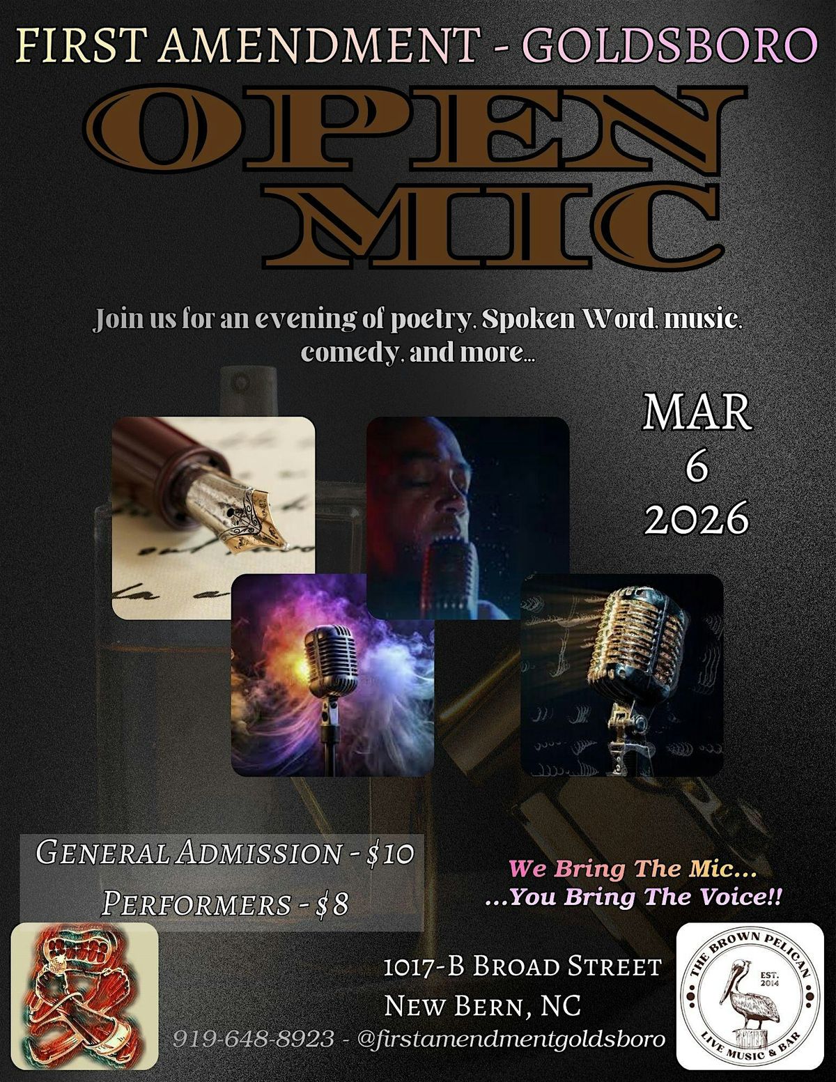 Join us at **The Brown Pelican** for a night of creativity and expression on **March 6, 2026 at 7:00 PM** (Eastern Time).