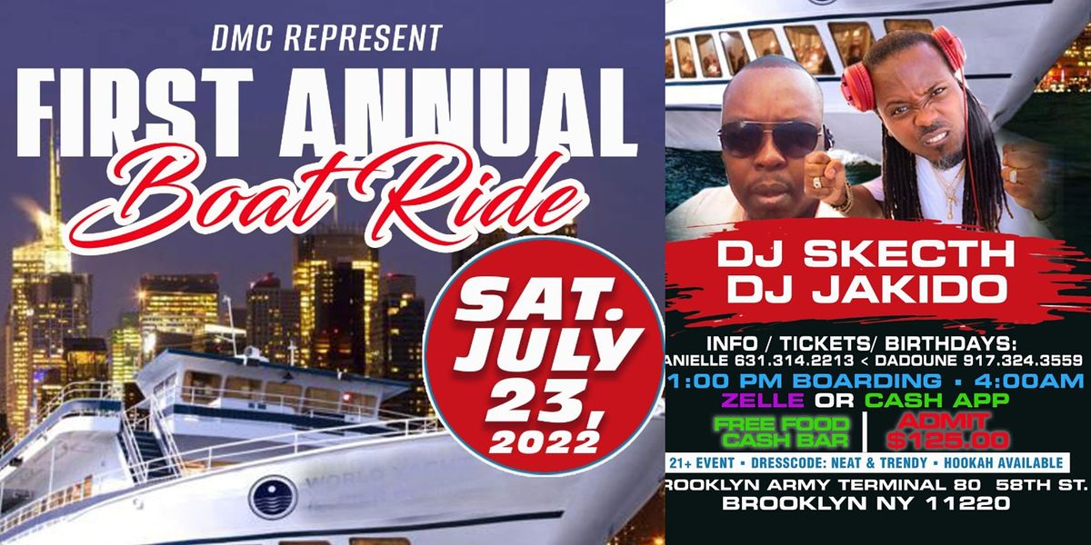 DMC Present: First Annual Boat Ride. FREE FOOD. CASH BAR.Saturday July 23rd, 2022. Introducing DJ SKETCH & DJ JAKIDO