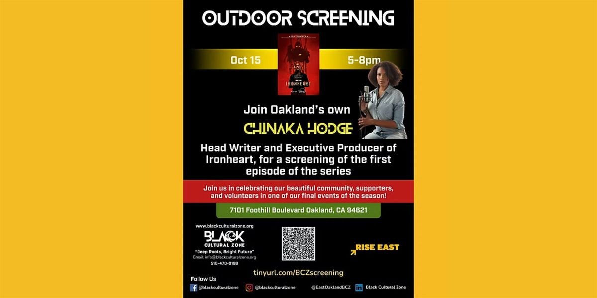 Join us for Black Cultural Zone CDC's First Annual East Oakland's Vibrant Corridors Movie Night, a fun-filled evening at Liberation Park. They are hosting a special outdoor screening of Marvel’s hit series IRONHEART — featuring Oakland’s own @chinakahodge , Head Writer & Executive Producer!