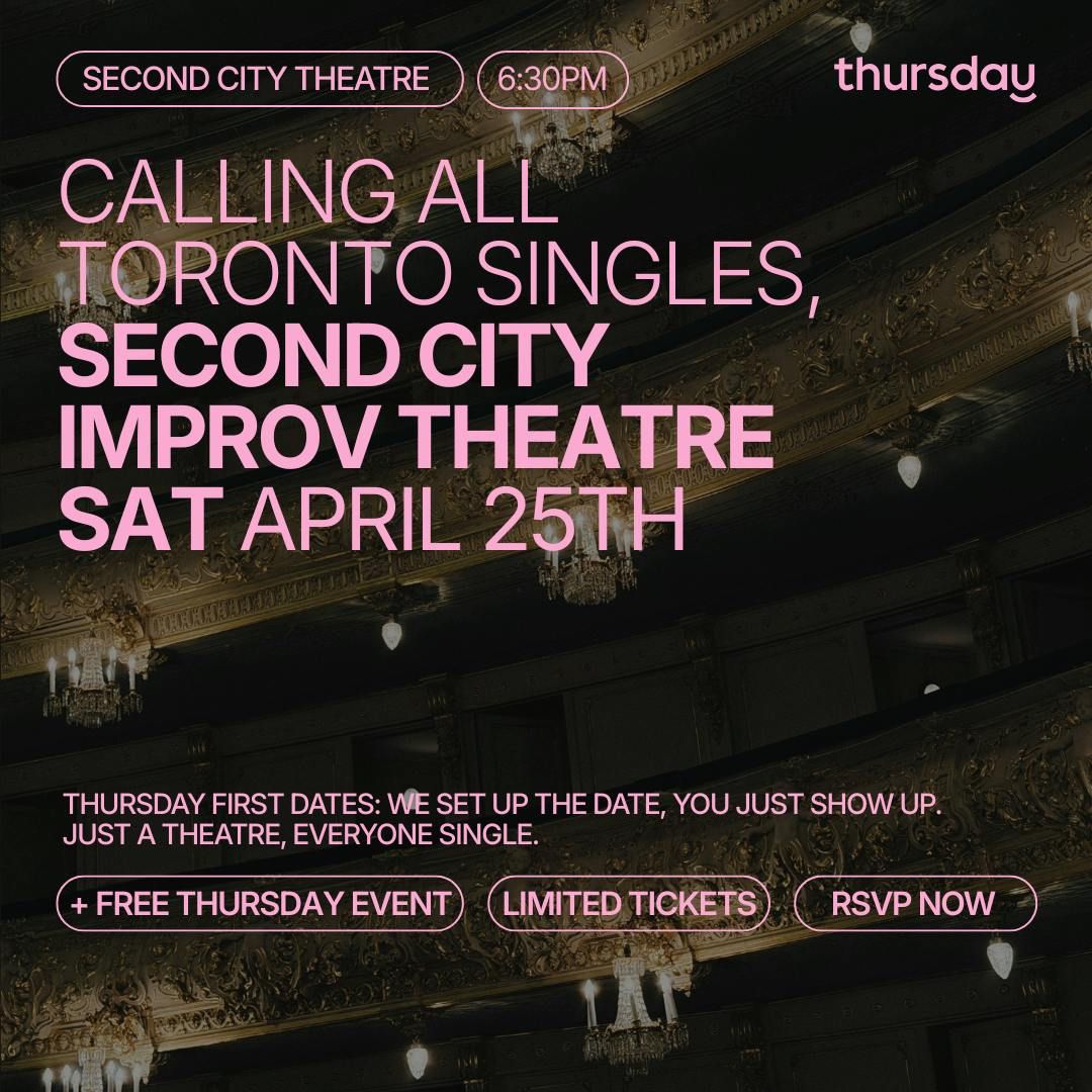 Just a THEATRE, surrounded by single's. Because the world in 2026 is all about meeting IRL, not on dating apps!Hey Toronto!We were blown away by your interest in our 2025 Thursday First Dates Theatre Experiences (where we set up the date, all you have to do is show up)! So, we're inviting you back to the theatre and this time we're taking over Second City Toronto, filling it up with singles. We're sweetening the deal - not only do you get a discounted ticket price to the theatre + post show mix and mingle, we're also throwing in a FREE ticket to Thursday Dating on April 23rd at National Bowling. Simply show your Second City Thursday ticket and you'll be granted a free pre-9pm entry. Limited seats available - get yours while you can!THE SHOW: World’s Gone Wild: Mainstage 91st Revue. The news is nonstop. Your group chat is unhinged. Life feels messy… Escape with The Second City’s World’s Gone Wild, a fast and fearless comedy show that finds funny in the frenzy. Outrageous characters, hilarious show-stopping musical numbers, and unpredictable improv comedy come together for a laugh-out-loud, anything-can-happen night of comedy mayhem. Smart. Ridiculous. Now. Pull up to The Second City and catch the chaos in real time.
