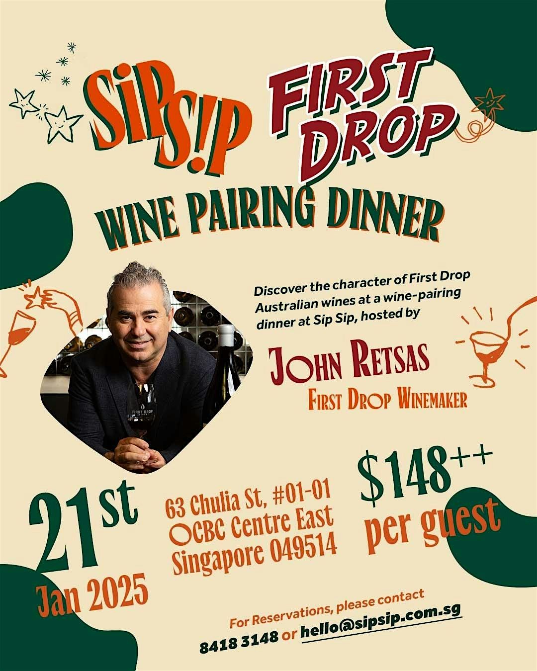 Discover First Drop Australian wines at an exclusive wine-pairing dinner at Sip Sip, hosted by Winemaker John Retsas.