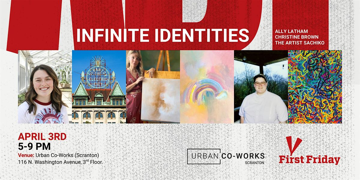 Join us at Urban Co-Works, Scranton for a First Friday Art Exhibit! On April 3rd, our show "Infinite Identities" will feature three talented artists whose work explores the changing identity of themselves and the world around them. We are excited to feature over fifty paintings and photographs during this event.