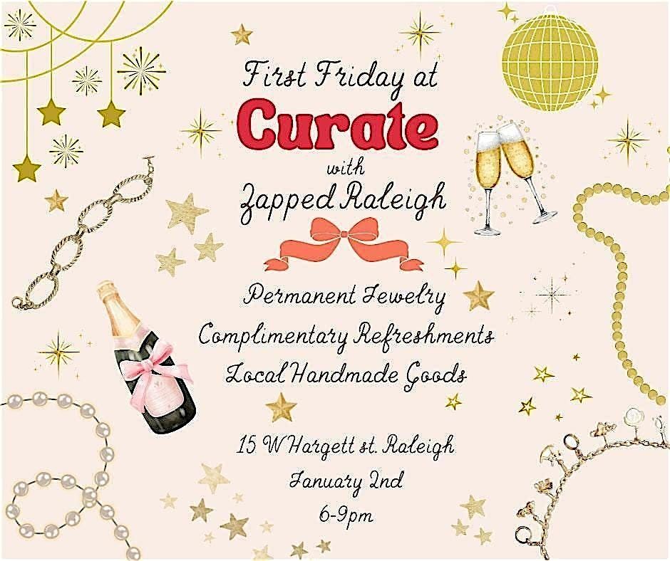 Join us Friday January 2nd at Curate for a permanent jewelry event with Zapped Raleigh! The Zapped team will be popping up with lots of high quality, tarnish resistant gold-filled, rose gold, solid gold and sterling silver chains as well as charms to choose from. Start the new year off right with a customizable jewelry piece that's sure to match your style! Enjoy complimentary refreshments while you shop our collection of handmade goods from over 40 local artists. We can't wait to ring in the new year with you!