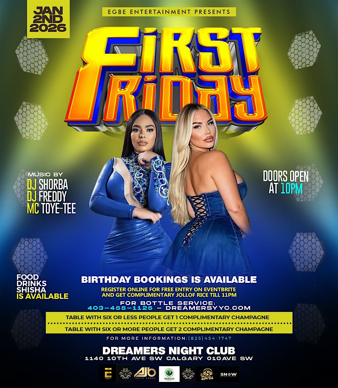 First Friday of the month. join us on January 2nd, 2026,get your free online complimert tickets and food before 11pm on Jan 2nd to register.