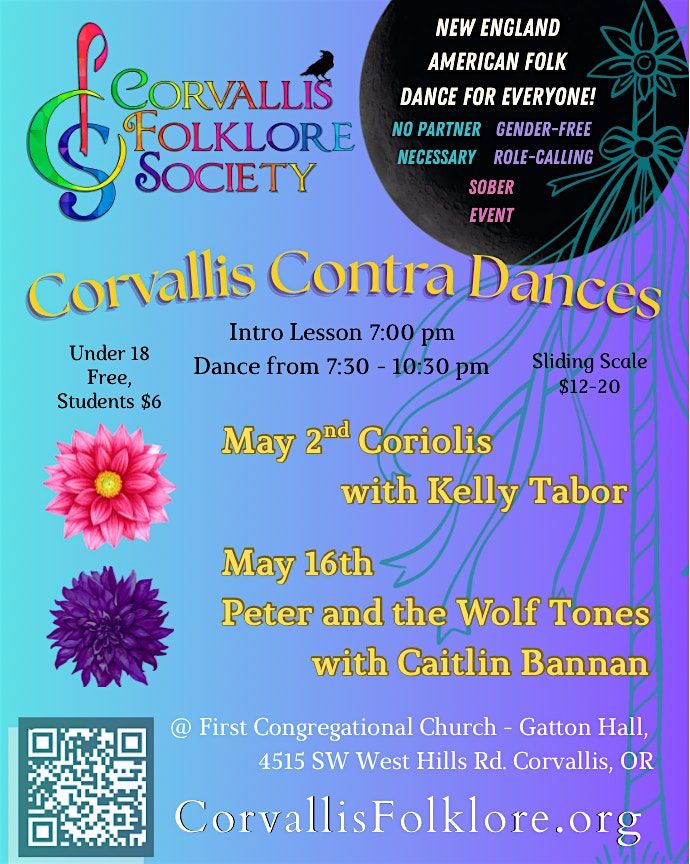 Contra dancing is super fun and welcoming to everyone. No partner necessary, no experience necessary. All dances are taught. Anyone can dance either role. Contra is an inclusive, queer friendly and sober social dance form originally from New England. Always live music and live calling, hosted by the Corvallis Folklore Society. We dance in Corvallis every first and third Saturday.