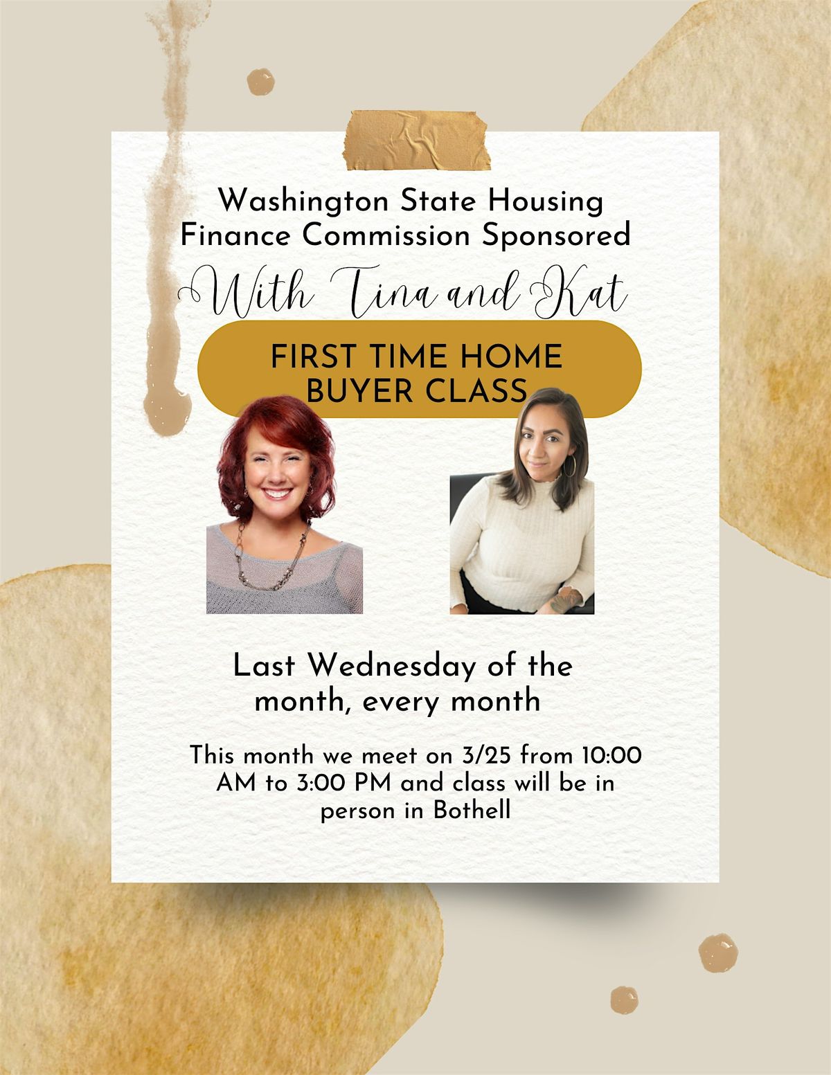 Kat and Tina provide you with a great classroom experience where you will learn all the things you need to know to get started on your home buying journey. Bonus, your time in class earns you the certificate of completion needed to access downpayment assistance programs in Washington State. Sign up today and get yourself one step ahead of the other buyers out there.
