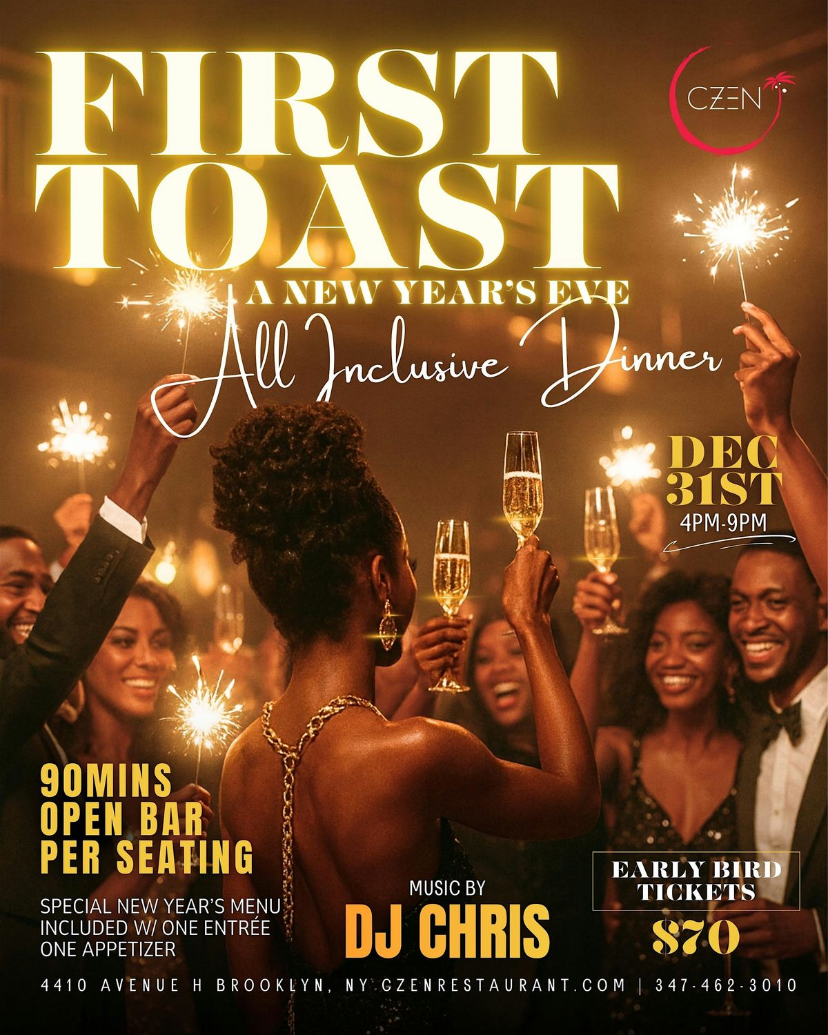 FIRST TOAST: NYE Dinner, 90-Minute Open Bar & DJ Chris at Czen Brooklyn