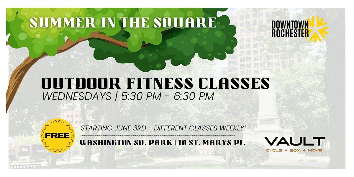 Get moving downtown! Fitness in Washington Square is a free outdoor fitness series featuring weekly workouts led by instructors from Vault Rochester, in a beautiful downtown park setting.