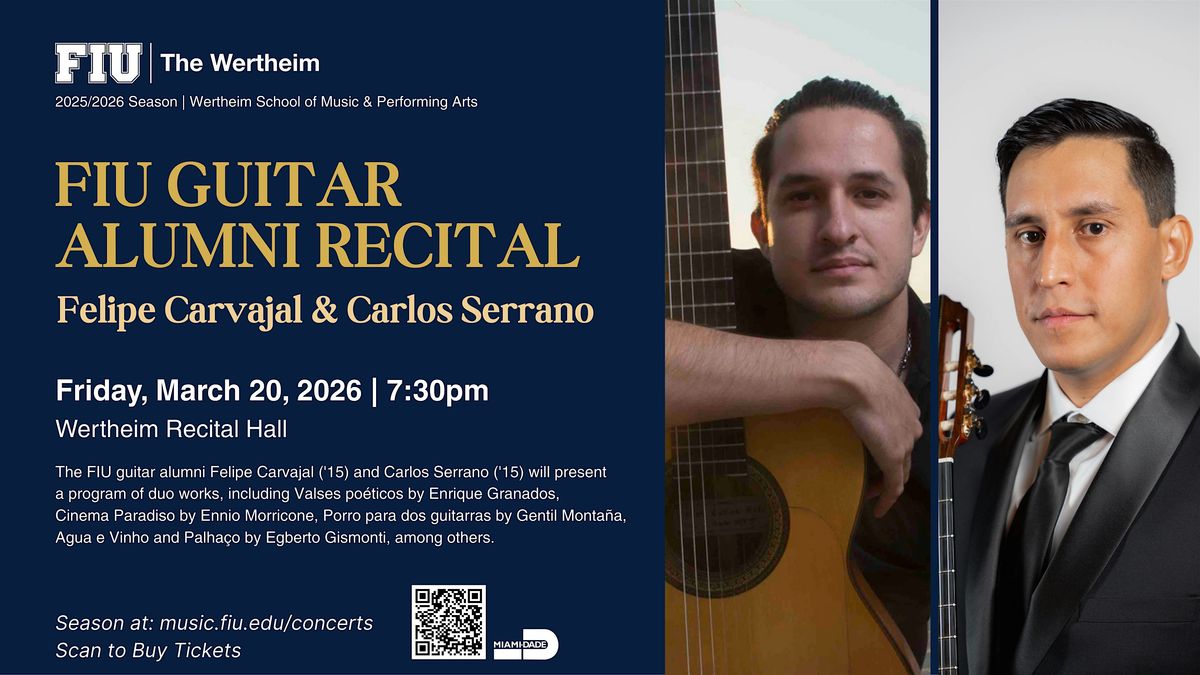 The FIU guitar alumni Felipe Carvajal ('15) and Carlos Serrano ('15) will present a program of duo works, including Valses poéticos by Enrique Granados, Cinema Paradiso by Ennio Morricone, Porro para dos guitarras by Gentil Montaña, Agua e Vinho and Palhaço by Egberto Gismonti, among others.
