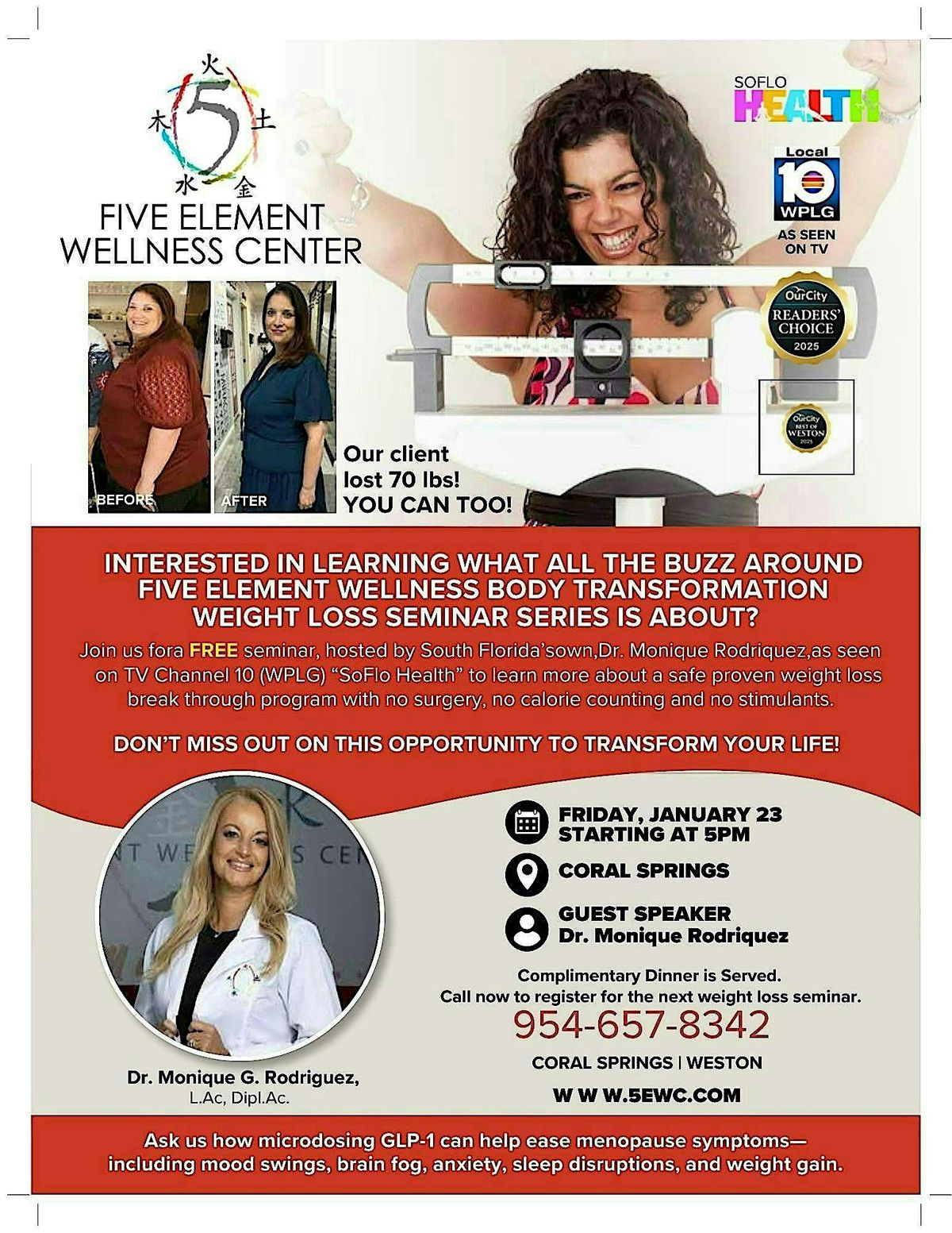 Five Element Wellness Center Weight Loss Body Transformation Seminar! Join us for an evening of inspiration and motivation as we delve into the secrets of achieving your weight loss goals and transforming your body. This in-person event will take place on Friday,January 23rd 2026 at 5pm in Coral Springs. Dinner will be provided during the event.Learn from expert in the field, Dr. Monique Rodriguez L. Ac, D. Ac.