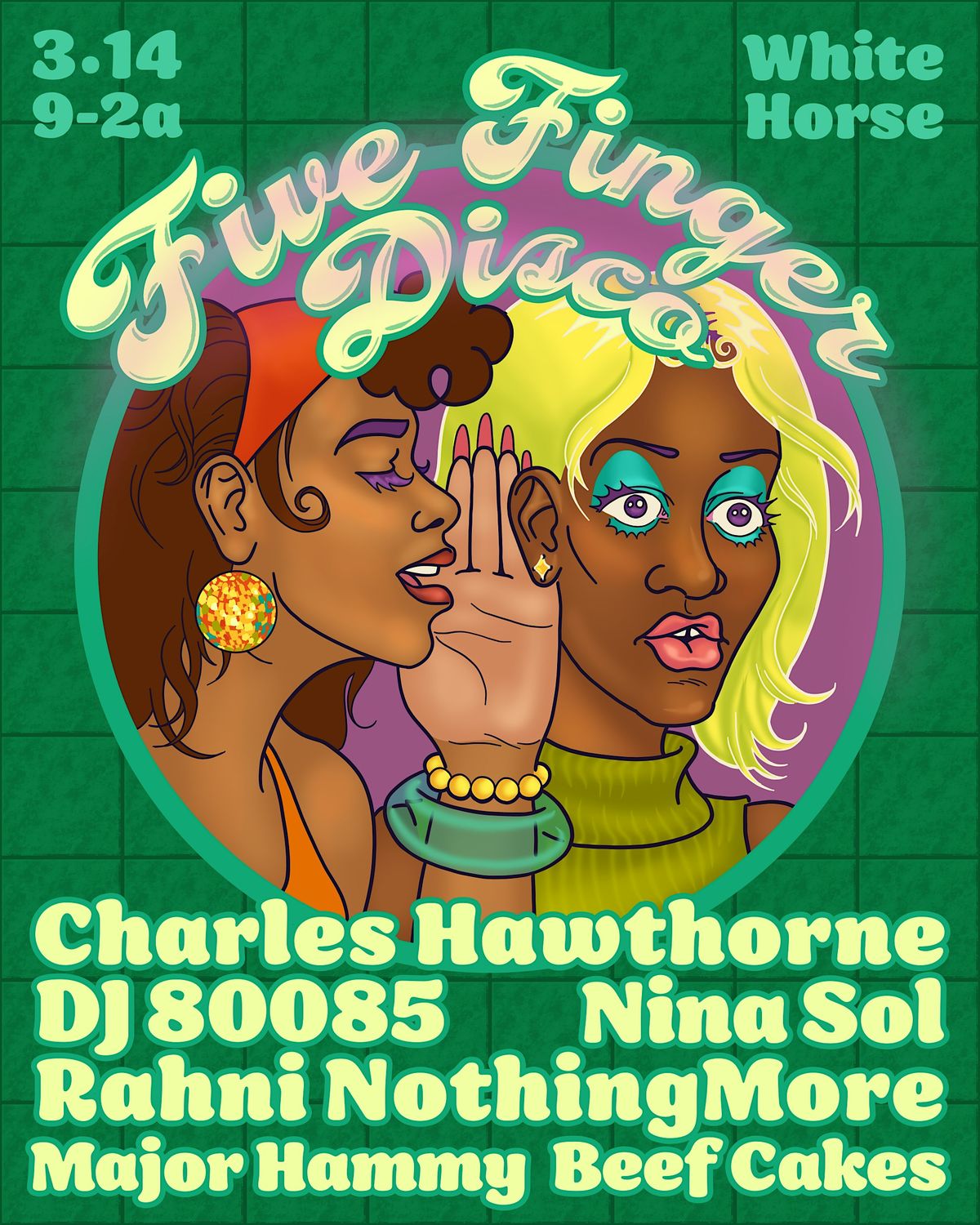 21+ with valid ID. Five Finger Disco celebrates the contributions of Black women and femmes in dance music and centers their experiences on the dancefloor. There is absolutely zero tolerance for racism, misogyny, transphobia, ableism, or being an asshole at FFD or the White Horse! Come correct, or don't come at all!