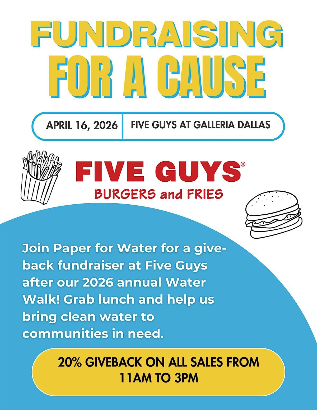 Join us for a fun-filled Five Guys Fundraiser happening right in your neighborhood! Come enjoy some mouth-watering burgers and fries while supporting a great cause. It's the perfect chance to hang out with friends, indulge in tasty eats, and make a difference—all in person. Don’t miss out on the yummy vibes and good times. See you there!