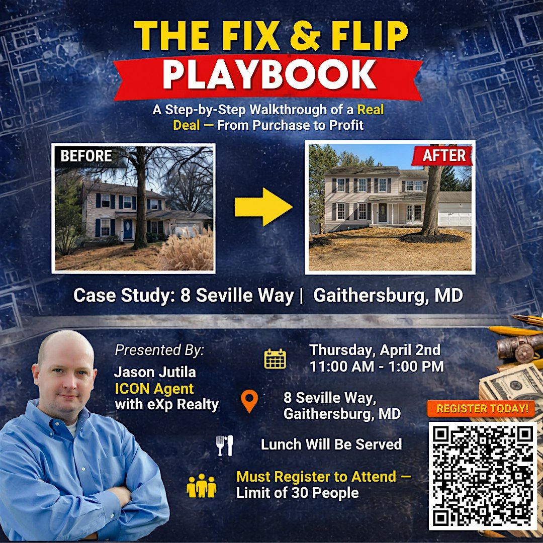 Discover the ins and outs of a real estate project with our Fix & Flip Case Study: 8 Seville Way, Gaithersburg, MD. This is your chance to see firsthand how Jason Jutila turned this property into a profit machine. Perfect for any eXp agent curious about flipping houses or looking to learn practical tips. Grab your spot, bring your questions, and get ready to dive into the exciting world of house flipping! Lunch will be served!