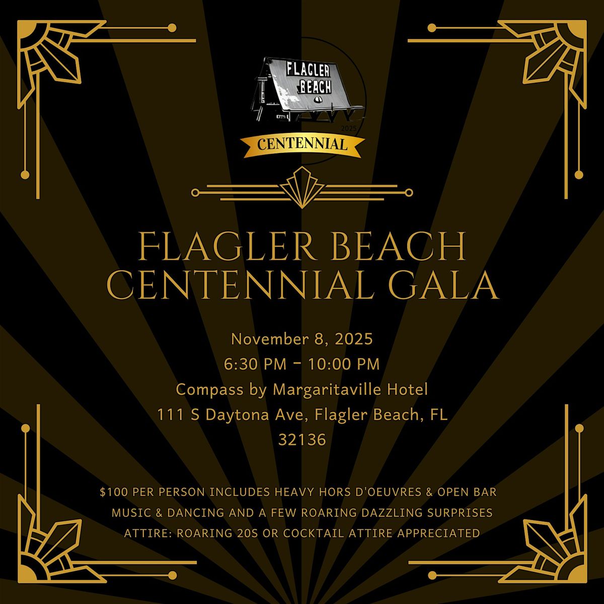 Celebrate 100 dazzling years of Flagler Beach at the Centennial Galaβan evening of jazz, glamour & roaring surprises!About this Event