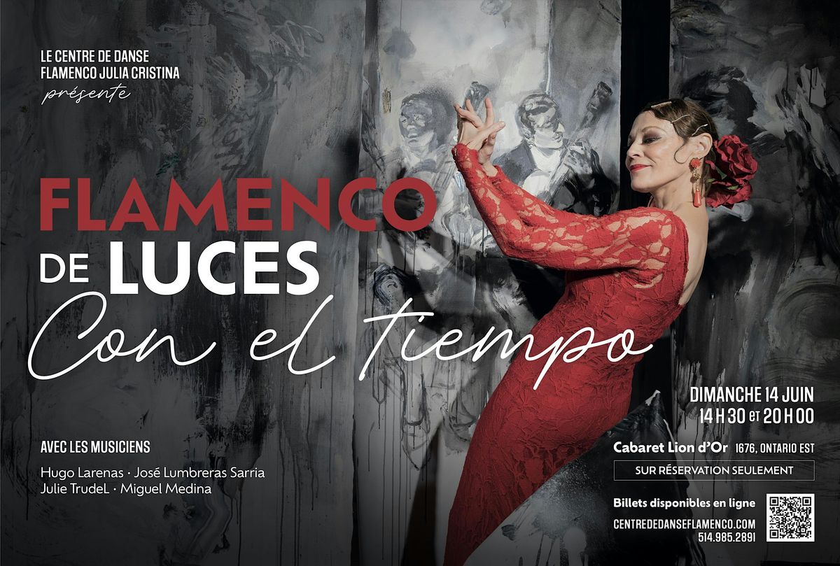 FLAMENCO DE LUCES, Con El Tiempo 14 juin 14h30 et 20h Pour la 26e édition consécutive, le CENTRE DE DANSE FLAMENCO JULIA CRISTINA présente son très attendu spectacle de fin d'année à l'élégant et feutré Cabaret Lion d'Or. CON EL TIEMPO est une succession de tableaux soutenus par le jeu unique et percutant de la guitare flamenca , qui relie avec virtuosité la danse, le chant et la percussion. Haut en couleurs, en rythme et en émotions, ce spectacle met en scène plus de 40 danseurs et 4 musiciens chevronnés: Hugo Larenas, José Lumbreras Sarria "El Chele», Julie Trudel et Miguel Medina .Un hommage par la danse flamenco à cette musique étonnante, écho de cultures hybridées avec le temps. Vibrez pour quelques heures au rythme de l'Espagne!!