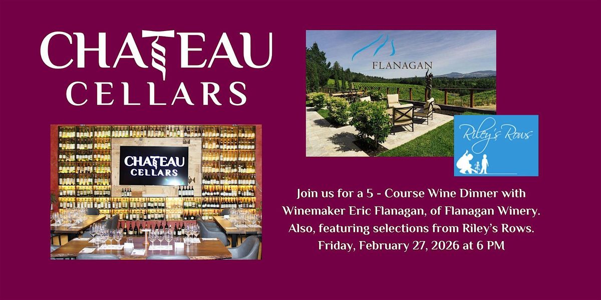 An unforgettable evening is uncorking at Chateau Cellars. Join us on Friday, February 27th at 6 PM for an intimate, curated wine dinner hosted by acclaimed winemaker Eric Flanagan. This is a rare opportunity to explore the artistry behind both Flanagan Wines and Riley’s Rows, guided by the winemaker himself.