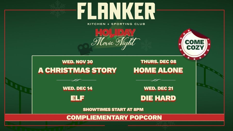 Flanker Holiday Movie Night is packed with some of your favorite Christmas Classics like A Christmas Story, Home Alone, Elf and Die Hard! Each show time will be at 8PM with complimentary popcorn!