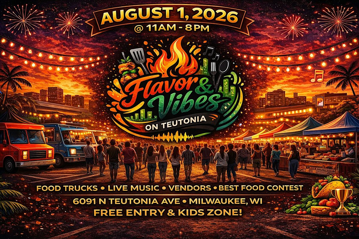 Get ready for Flavor & Vibes on Teutonia—Milwaukee’s ultimate summer festival! 🔥 Join us on August 1, 2026 from 11AM–8PM at 6091 N Teutonia Ave for a day filled with amazing food trucks, live music, local vendors, and family-friendly fun. 🍔 Taste your way through the city 🎶 Enjoy live music & DJs 🛍️ Shop local vendors 🏆 Experience the Battle of the Flavors and vote for your favorite food truck 🎈 Kids Zone for the whole family FREE ENTRY — All are welcome!