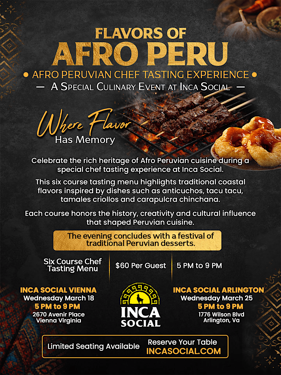 Reserve your seats now and experience the flavors, music and culture of Afro Peruvian cuisine at Inca Social.