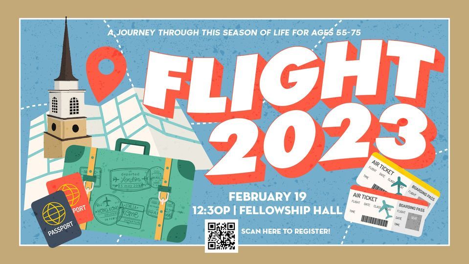 Life is a journey. If you are in a season where you are thinking about retirement, grandkids, caring for aging parents, or wondering what is next for you, then join us for FLIGHT 2023. We will be departing February 19 from the Fellowship Hall at 12:30 with inflight food and fellowship. This ministry is about helping adults ages 55-75 navigate a fun-filled season of life. We’ll explore together how to build community, be active, grow spiritually, learn about life, and serve others by living the Jesus Way. Don’t miss out on the best years of your life! Don't forget to invite a friend and click the link below to register: https://fbcarlington.ccbchurch.com/goto/forms/599/responses/new