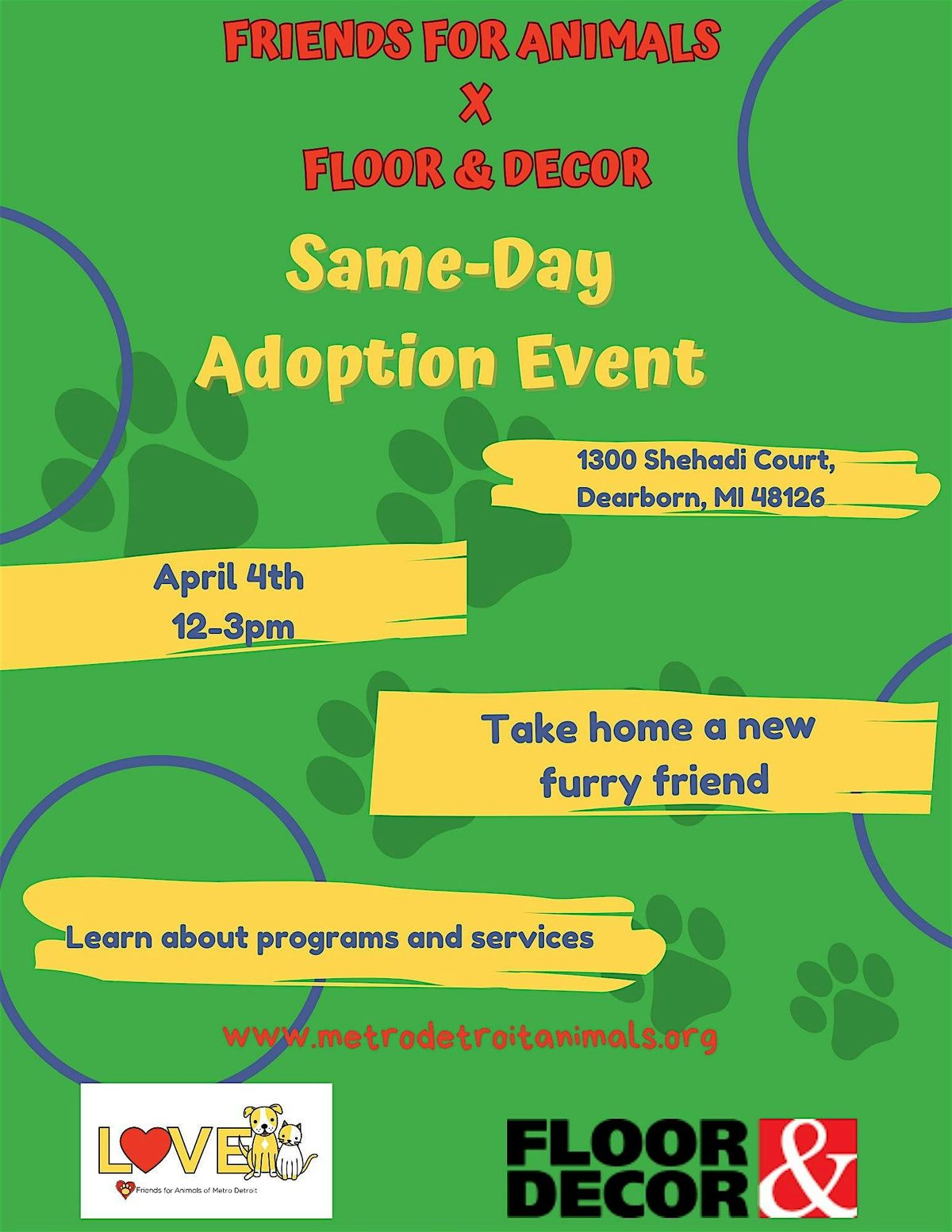 Join us at our new neighborhood partner's, Floor & Decor, located at 1300 Shehadi Court in Dearborn, for an offsite same-day adoption event! Learn about our programs and services, take home a furry friend and learn how to get involved!